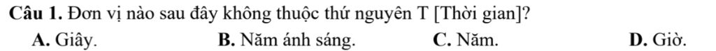 Câu 1. Đơn vị nào sau đây không thuộc thứ nguyên T [Thời gian]?