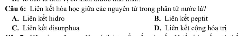 `-` Trong phân tử nước (H₂O), nguyên tử oxy và hai nguyên tử hydro liên kết với nhau thông qua liên kết cộng hóa trị.