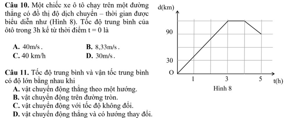 Câu 10. Một chiếc xe ô tô chạy trên một đường thẳng có đồ thị độ dịch chuyển – thời gian được biểu diễn như (Hình 8). Tốc độ trung bình của ôtô trong 3h kể từ thời điểm t= 0 là