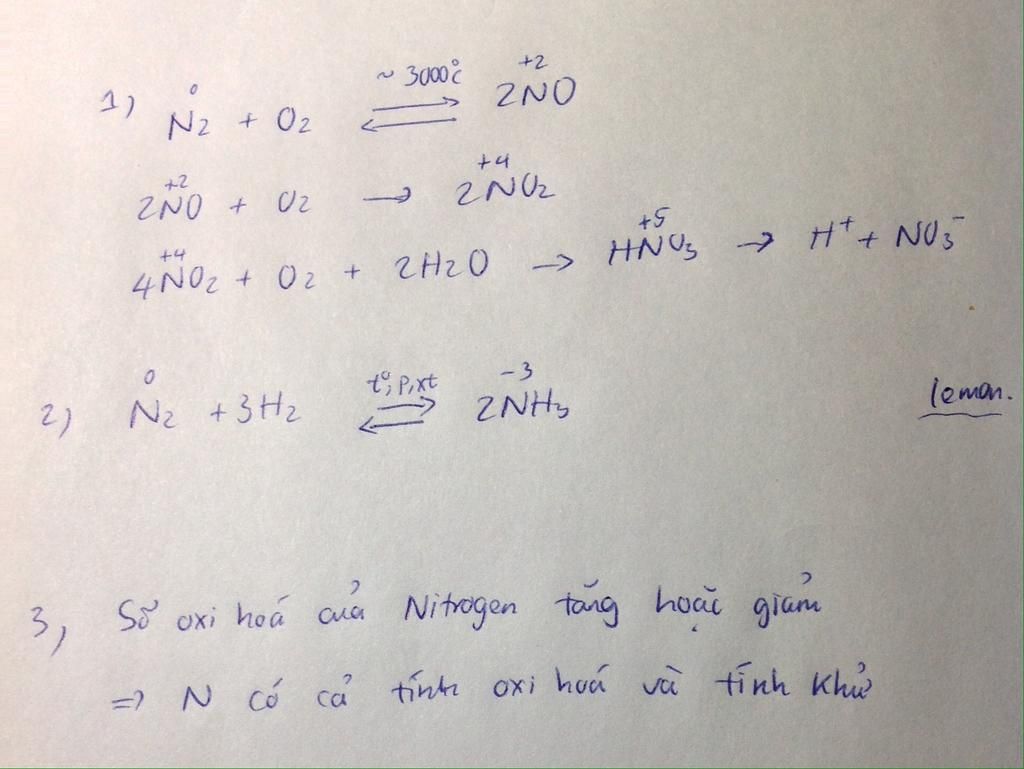 $\rm 1, N_2+O_2\xrightarrow{\text{tia lửa điện}} 2NO \\ 2NO+O_2 \to 2NO_2 \\ 4NO_2+O_2+2H_2O\to 4HNO_3 \\2, N_2+3H_2\buildrel{{t^o,p,xt}}\over\rightleftharpoons 2NH_3 $