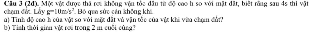 Câu 3 (2đ). Một vật được thả rơi không vận tốc đầu từ độ cao h so với mặt đất, biết rằng sau 4s thì vật chạm đất. Lấy g=10m/`s^2`. Bỏ qua sức cản không khí.
