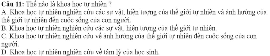 Khoa học tự nhiên là sự nghiên cứu các sự vật, hiện tượng của thế giới tự nhiên và có ảnh hưởng của thế giới tự nhiên đến cuộc sống của con người.