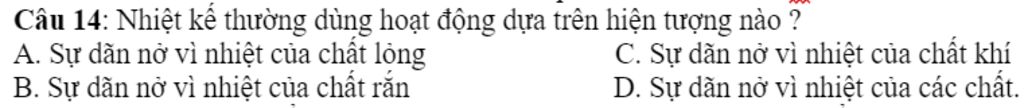 Câu 14: Nhiệt kế thường dùng hoạt động dựa trên hiện tượng nào ?
