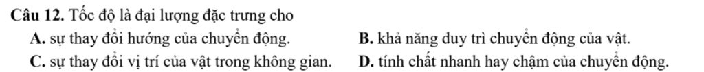 Câu 12. Tốc độ là đại lượng đặc trưng cho