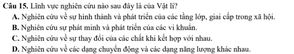 Câu 15. Lĩnh vực nghiên cứu nào sau đây là của Vật lí?
