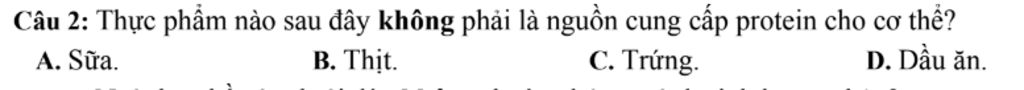 Câu 2: Thực phẩm nào sau đây không phải là nguồn cung cấp protein cho cơ thể?