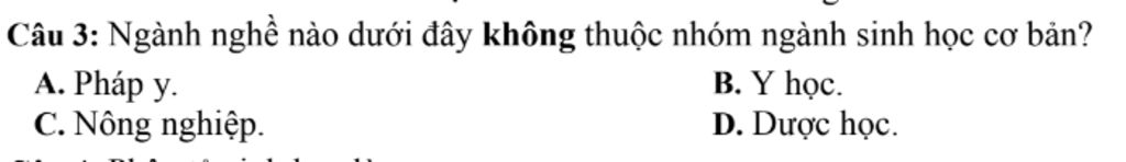 `-` Pháp y không thuộc nhóm ngành sinh học cơ bản, mà là một lĩnh vực ứng dụng của sinh học trong điều tra tội phạm và phân tích pháp lý. Các ngành còn lại (y học, nông nghiệp, dược học) đều liên quan trực tiếp đến sinh học cơ bản.