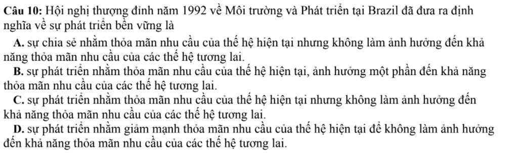 `-` Hội nghị thượng đỉnh năm 1992 về Môi trường và Phát triển tại Brazil đã đưa ra định nghĩa về sự phát triển bền vững là sự chia sẻ nhằm thỏa mãn nhu cầu của thế hệ hiện tại nhưng không làm ảnh hưởng đến khả năng thỏa mãn nhu cầu của các thế hệ tương lai