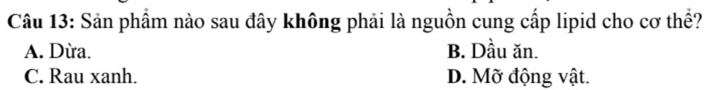 Rau xanh chủ yếu cung cấp vitamin, khoáng chất và chất xơ, nhưng không phải là nguồn chính cung cấp lipid. Ngược lại, dừa, dầu ăn và mỡ động vật đều chứa nhiều lipid.