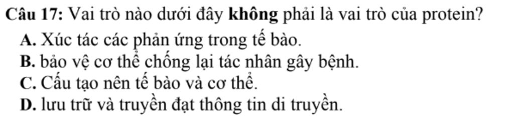 Vai trò không phải là vai trò của protein là lưu trữ và truyền đạt thông tin di truyền. Đây là vai trò của acid nucleotide, các phân tử DNA có thể tự nhân đôi, giúp truyền đạt thông tin di truyền chỉ dẫn cho các tế bào tổng hợp protein.
