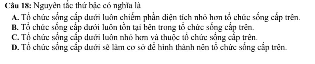 `-` Nguyên tắc này chỉ ra rằng các tổ chức sống cấp dưới tạo thành các tổ chức sống cấp trên. Tổ chức sống cấp dưới không chỉ nhỏ hơn mà còn tồn tại và hoạt động trong bối cảnh của tổ chức sống cấp trên.