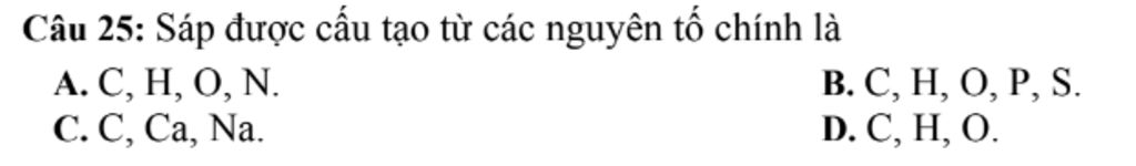 `-` Sáp chủ yếu là các este của axit béo với rượu dài, vì vậy nó chủ yếu chứa carbon (C), hydro (H) và oxy (O).