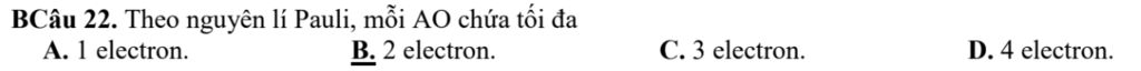 Câu 22. Theo nguyên lí Pauli, mỗi AO chứa tối đa