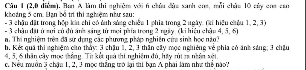 Câu 1 (2,0 điểm). Bạn A làm thí nghiệm với 6 chậu đậu xanh con, mỗi chậu 10 cây con cao khoảng 5 cm. Bạn bố trí thí nghiệm như sau: