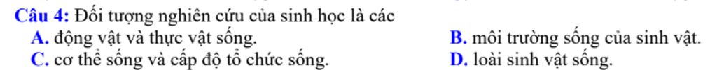 Câu `4`: Đối tượng nghiên cứu của sinh học là các