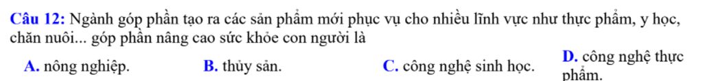 Ngành góp phần tạo ra các sản phẩm mới phục vụ cho nhiều lĩnh vực như thực phẩm, y học, chăn nuôi nó góp phần nâng cao sức khỏe con người là công nghê sinh học