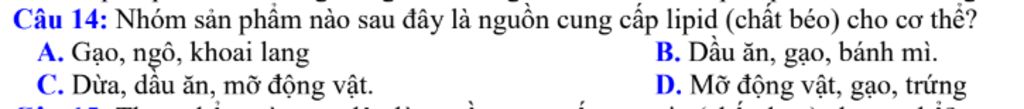 Câu 14: Nhóm sản phẩm nào sau đây là nguồn cung cấp lipid (chất béo) cho cơ thể?