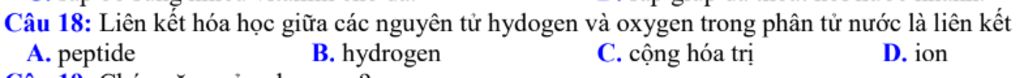 `-` Liên kết giữa các nguyên tử hydro và oxy trong phân tử nước (H₂O) là liên kết cộng hóa trị, nơi các nguyên tử chia sẻ electron.