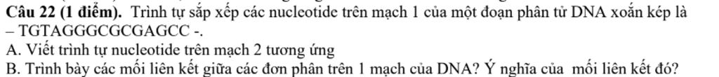 Câu 22 (1 điểm). Trình tự sắp xếp các nucleotide trên mạch 1 của một đoạn phân tử DNA xoắn kép là