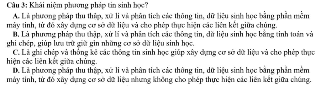 `-` Khái niệm phương pháp tin sinh học là phương pháp thu thập, xử lí và phân tích các thông tin, dữ liệu sinh học bằng phần mềm