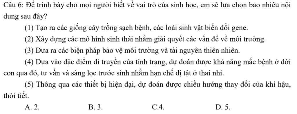 Câu `6`: Để trình bày cho mọi người về vai trò của sinh học, em sẽ lựa chọn bao nhiêu nội dung sau đây?