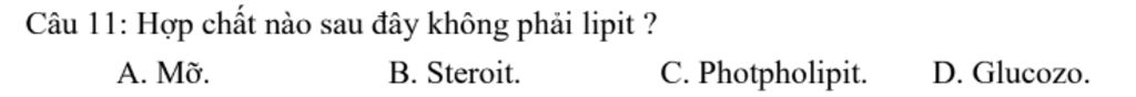 Câu `11`: Hợp chất nào sau đây không phải lipit?