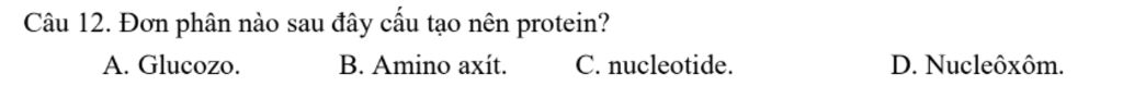 Câu `12`: Đơn phân nào sau đây cấu tạo nên protein?