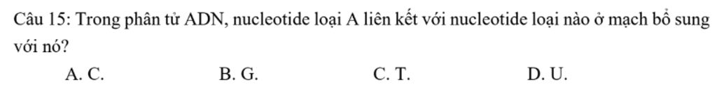 Câu 15: Trong phân tử ADN, nucleotide loại A liên kết với nucleotide loại nào ở mạch bổ sung với nó? A. C. B. G. C. T. D. U.