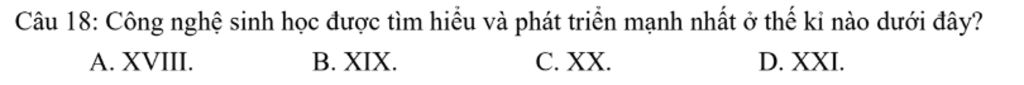 Câu `18`: Công nghệ sinh học được tìm hiểu và phát triển mạnh nhất ở thế kỉ nào dưới đây?