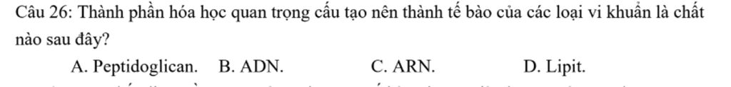 Peptidoglican là cấu trúc chính tạo nên thành tế bào vi khuẩn, giúp bảo vệ và duy trì hình dạng của chúng`-> A`Vậy chọn `A`