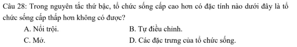 Câu 28: Trong nguyên tắc thứ bậc, tổ chức sống cấp cao hơn có đặc tính nào dưới đây là tổ