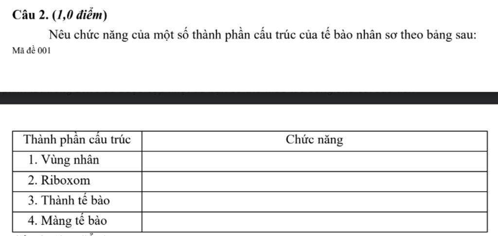Nêu chức năng của một số thành phần cấu trúc của tế bào nhân sơ theo bảng sau: