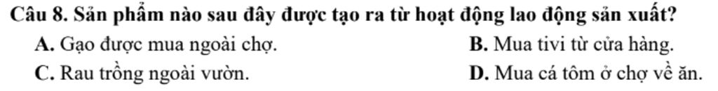 Câu `8`: Sản phẩm nào sau đây được tạo ra từ hoạt động lao động sản xuất?