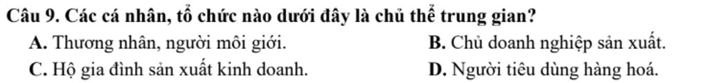 Câu `9`: Các cá nhân, tổ chức nào dưới đây là chủ thể trung gian?