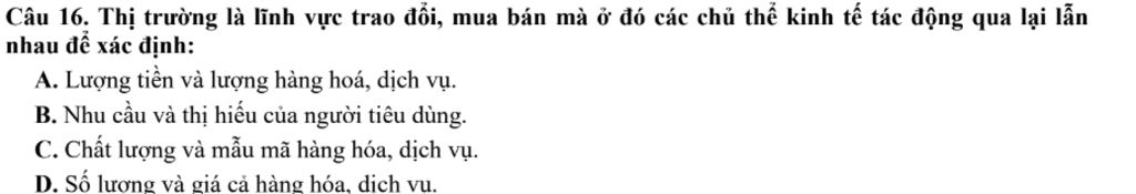 Câu `16`: Thị trường là lĩnh vực trao đổi, mua bán mà ở đó các chủ thể kinh tế tác động qua lại lẫn nhau để xác định: