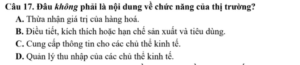 Câu `17`: Đâu không phải là nội dung về chức năng của thị trường?