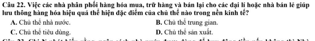 Câu `22`: Việc các nhà phân phối hàng hóa mua, trữ hàng và bán lại cho các đại lý hoặc nhà bán lẻ giúp lưu thông hàng hóa hiệu quả thể hiện đặc điểm của chủ thể nào trong nền kinh tế?