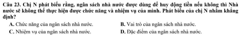 Câu `23`: Chị N phát biểu rằng, ngân sách nhà nước được dùng để huy động tiền nếu không thì Nhà nước sẽ không thể thực hiện được chức năng và nhiệm vụ của mình. Phát biểu chị N nhằm khẳng định?