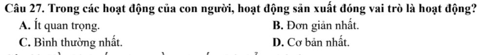 Câu `27`: Trong các hoạt động của con người, hoạt động sản xuất đóng vai trò là hoạt động?