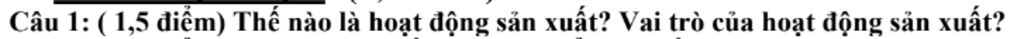 `->` `-`Hoạt động sản xuất là quá trình con người sử dụng các yếu tố sản xuất để tạo ra sản phẩm vật chất và tinh thần nhằm đáp ứng nhu cầu của xã hội.