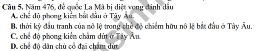 Câu `5.` Năm `476`, đế quốc La Mã bị diệt vong đánh dấu