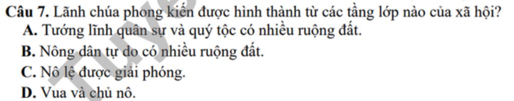 Câu `7.` Lãnh chúa phong kiến được hình thành từ các tầng lớp nào của xã hội`?`