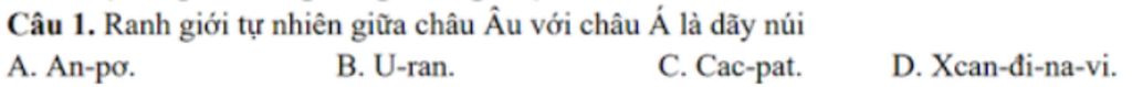 Câu `1.` Ranh giới tự nhiên giữa châu Âu với châu Á là dãy núi