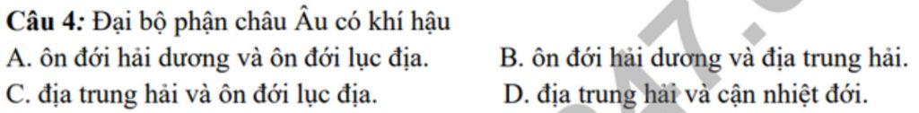 Câu `4:` Đại bộ phận châu Âu có khí hậu