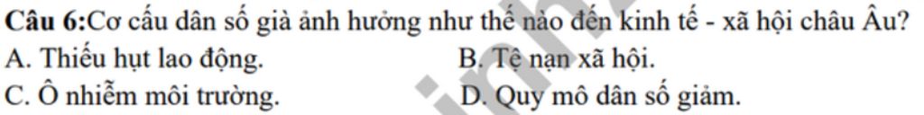 Câu `6:` Cơ cấu dân số già ảnh hưởng như thế nào đến kinh tế `-` xã hội châu Âu`?`