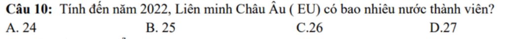 `-` Tính đến năm `2022,` Liên mình Châu Âu (EU) có `27` nước thành viên.