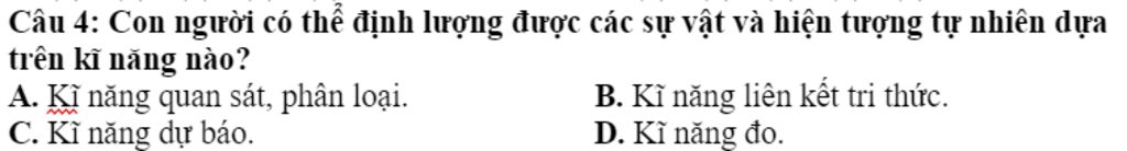 Câu `4:` Con người có thể định lượng được các sự vật và hiện tượng tự nhiên dựa trên kĩ năng nào`?`