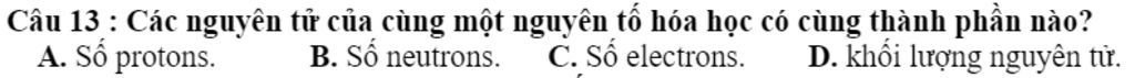 Câu `13:` Các nguyên tử của cùng một nguyên tố hóa học có cùng thành phần nào `?`