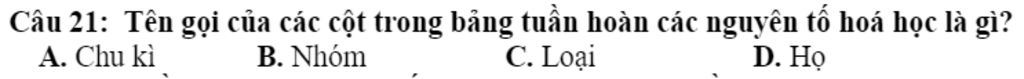 Câu `21:` Tên gọi của các cột trong bảng tuần hoàn các nguyên tố hoá học là gì `?`