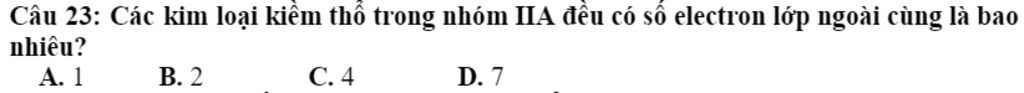Câu `23:` Các kim loại kiềm thổ trong nhóm `IIA` đều có số $electron$ lớp ngoài cùng là bao nhiêu?